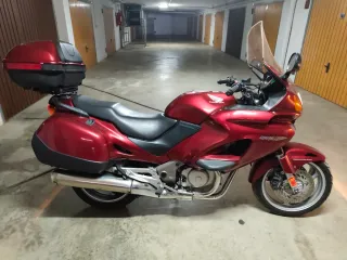Moto Honda Deauville nt700v en color rojo. Maletas integradas para mayor capacidad. Transmisión por cardán sin mantenimiento. Baúl de 46 litros con capacidad para dos cascos. 166.000km, todos hechos en carretera. Moto muy cuidada en perfecto estado, motor irrompible y fiable.