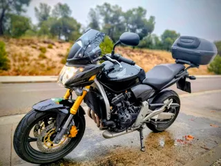 Moto Honda CB 600 F Hornet en color negro. Ideal para disfrutar de la carretera. - Moto estilo naked. - Transmisión manual. - 103 cv - 20800km Muy cuidada, un solo propietario, siempre en garaje, la vendo por hacer uso solo en ciudad. Cómo extras integrados tiene indicador de marcha, cúpula, baúl para dos cascos integrales de 45l y puños calefactables.