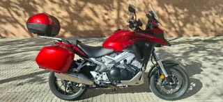 Moto Honda VFR 1200 DCT en color rojo, con maleta trasera. - Transmisión automática. - Estilo touring. - Asiento de gel - Manillar LCL valorado en 300€ - Soporte original Honda, mas baúl valorado en más de 500€ - Ruedas pirelli angel gt2 con menos de 10000km - Cúpula ahumada alta - Filtros y aceite recien puestos -62000km. Año 2010