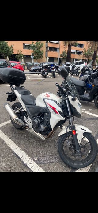 Moto Honda CB500F en color blanco, estilo naked en buen estado. Tiene 64.000km, Itv hasta agosto de 2027. Última revisón hace 6 meses filtros y aceite y pastillas delanteras. Venir a probar sin problema. Lo más próximo para hacer rueda y pastillas traseras y en unos 1000km kit de transmisión. Baul, cupula givi y soporte movil incluido.