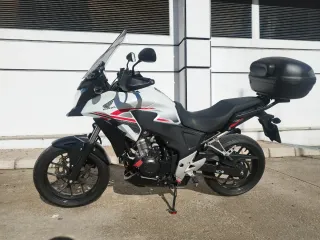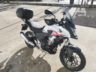 Moto Honda CB500X en color blanco y detalles rojos. Ideal para rutas y aventuras. - Cúpula alta para mayor protección. - Maleta trasera negra incluida. - Protector de motor rojo. - Guardamanos negros. Entrego cúpula original y agarraderas originales. La moto tiene neumáticos nuevos, revisión hecha recientemente, pastillas de frenos, ITV recién pasada. Km 39658.