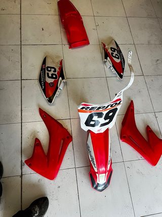 Kit de plásticos para moto Honda CR. - Guardabarros delantero. - Placa portanúmeros. - Tapas laterales.