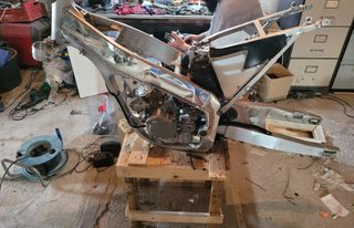 Se vende chasis de moto con motor honda GLR 125 incluido. Ideal para proyectos o repuestos. - Estructura metálica robusta. - Componentes del motor visibles.