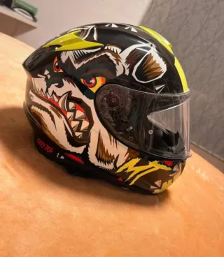 Casco de moto con un diseño llamativo de un perro. - Diseño Crazy Dog. - Combinación de colores negro y amarillo. - Visera transparente.