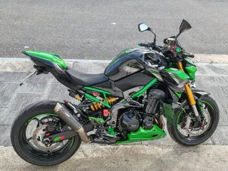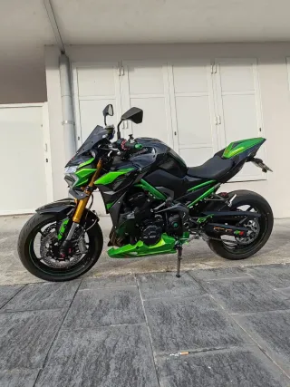 Moto Kawasaki Z900 en llamativo color verde y negro. - Diseño deportivo y agresivo. - Chasis tubular de acero. - Suspensión delantera invertida. - Escape deportivo SC Project GP2.