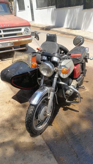 Sanglas 400 arranque electrico y patada, año 73, nunca restaurada, totalmente original, salio de fabrica con sidecar, pero no figura en documentacion, en esa epoca no existian ITV, s...si se hace historica el ingeniero puede añadir sidecar a documentacion u homologarla, aunque siempre circule con sidecar y nunca tuve problemas, unicamente pasar itv sin el. Pase itv favorable hace un tiempo y no la use mas, esta parada, hacer puesta a punto, poner bateria y cambiar algun reten, fuga aceite... No cambios y no negociable!!