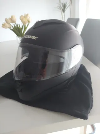 Casco modular de moto integral en color negro mate. Incluye visera transparente,visor solar,cierre de evilla, muy ligero incluye funda de casco,esta impecable ya que solo me lo e puesto 1 vez,talla s - Marca: COURSE - Color: Negro mate - Visera: Transparente
