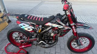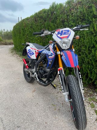 Se vende Rieju Mrt Pro muy cuidada con ITV 2027,doy todas las piezas de casa,motor,etc. De motor tiene 86tpr hecho por TTH en Agosto, saca 29cv y va muy fino. Kit cilindro y cigüeñal top tpr 86, escape Krm 90/100cc, carburador Swr 34mm, rotor MVT naranja, transmisión primaria TOP, embragues Stage 6 mk2, tambor Top, tobera Sr Racing, caja de láminas italkit. Motor usado con 98 y putoline. Estética: Careta KTM Led, guardabarros acerbis, manillar Dyna Racing, gas Domino, manetas Motoforce y Dopler, portamatriculas corto, vinilos Studio 27, llantas trophy rojas.Se puede dar de serie, se vende por el coche, no ofertas ridículas,642680258