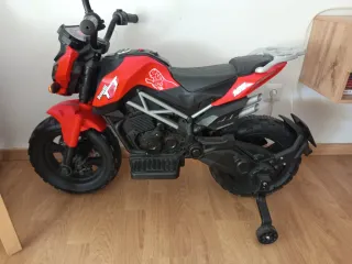 Moto eléctrica infantil de color rojo, ideal para niños de hasta 5 o 6 años. Perfecta para iniciarse en el mundo de las dos ruedas,lleva ruedines puestos. El precio es porque hay que cambiar la bateria,cuando se uso la ultima vez este verano ya no tenia micha fuerza porque la bat estaba agotandose. También le falta un retrovisor,se ve en la foto. El resto está en muy buen estado,no tiene rayajos. Es de las motos infantiles más grandes del mercado,no es de las pequeñitas. Medidas: altura al asiento 60cm al manillar 83cm Largo 129 cm - Diseño deportivo inspirado en motos reales. - Sonidos,músicas varias y luces,se puede conectar un US