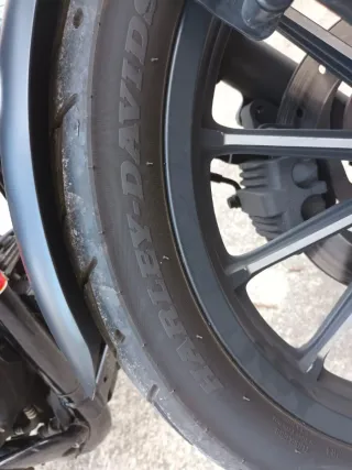 Rueda de moto Harley Davidson. - Llanta negra con detalles. - Neumático con inscripción de la marca.