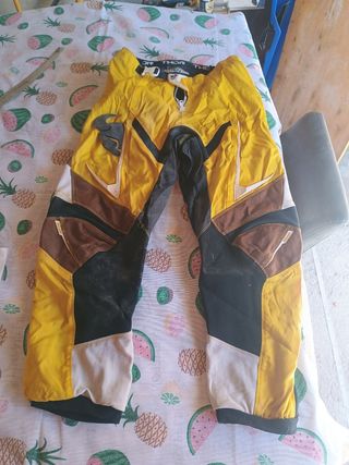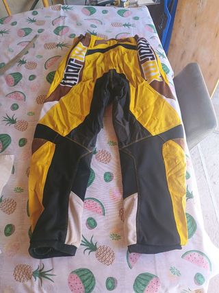 Pantalón de motocross de la marca Thor, talla 30. Está en buenas condiciones, aunque presenta un ligero desgaste por el uso. - Marca: Thor - Talla: 30 - Color: Amarillo, marrón y negro - Material: Poliéster resistente