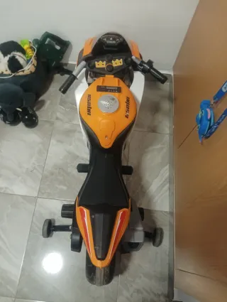 Moto eléctrica infantil con diseño deportivo, inspirada en el equipo Repsol. - Colores naranja, blanco y rojo. - Ruedines de apoyo para mayor estabilidad. - Diseño deportivo y llamativo.
