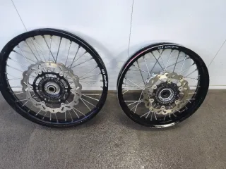 Juego de llantas para moto. - Llantas de color negro y plateado. - Compatibles con KTM 690R, Husqvarna 701 y Gasgas 700 - Estilo enduro, off-road y supermoto.