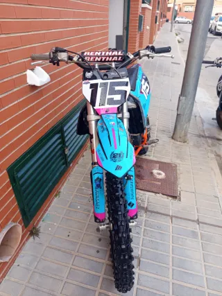 Moto de cross KTM SX 85cc con un diseño llamativo en azul y rosa. - Manillar Renthal. - Número 115 en la placa frontal. - Gráficos personalizados. - Neumáticos de tacos para off-road. - motor recién hecho viela y cigüeñal y pistón la moto está muy cuidada lista para carreras - Amortiguadores delanteros y traseros hechas por M1R Tubo de escape hgs bud Año 2024