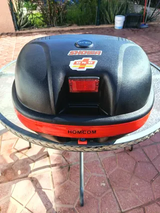 Cofre para moto de la marca SHOWA, con un diseño elegante y funcional. - Color principal negro con detalles en rojo. - Acabado brillante y resistente. - Incluye cerradura de seguridad. -hay que cambiar cerradura,perdí las llaves