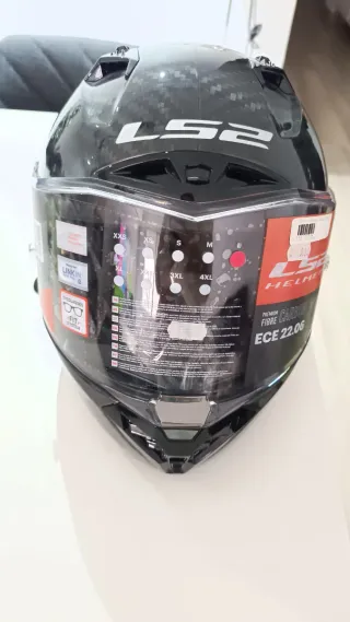 Casco de moto LS2 con acabado en fibra de carbono. - Modelo: LS2 - Material: Fibra de carbono - Certificación: ECE 22.06 - Tallas disponibles indicadas en la etiqueta: XXS, XS, S, M, L, XL, XXL, 3XL, 4XL - Incluye sistema Fit System para gafas.
