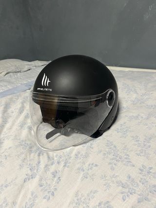 Casco de moto negro con visera transparente. - Marca: MT Helmets - Estilo: Scooter - Color: Negro - Visera: Transparente Sin practicamente uso, las marcas que tiene son de cuando se ha caido el casco