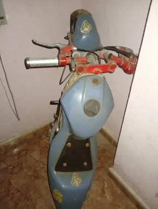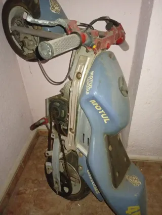 Mini moto estilo moped con detalles en azul y rojo. Lleva mucho tiempo parada está para poner a punto i acerle 4 cosas pero funcionaba mui bien...