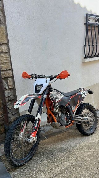 Moto de enduro y motocross KTM 300 del año 2012. Un modelo icónico para los amantes de la competición y el off-road. - Diseño deportivo en naranja y blanco. - Transmisión manual.