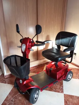 Scooter de movilidad Libercar en color burdeos. Diseñada para ofrecer comodidad y facilidad de uso. -NUEVO SOLAMENTE DOS VECES UTILIZADO. - Asiento acolchado y giratorio. - Cesta delantera. - Ruedas neumáticas. - Espejos retrovisores.