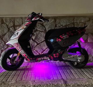 Aprilia Sonic 50cc con un diseño llamativo y personalizado. - Decoración única en negro, blanco y rosa. - Detalles deportivos y gráficos. - Iluminación LED inferior para un estilo moderno. -Doy: Escape de serie , variador malossi , muelles polini, retrovisor original,faro de atras de serie Itv hasta noviembre 2026 -La vendo por falta de uso -Precio negociable