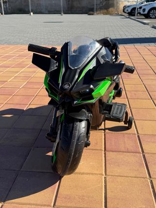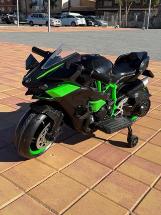 Moto eléctrica infantil con un diseño deportivo en colores negro y verde. Cuenta con extras como música, luces Led y entrada de USB. Usada 2 ratos en reyes. Como nueva. Conservo su caja original. - Ruedines de apoyo incluido. - Cargador incluido. - 12V.