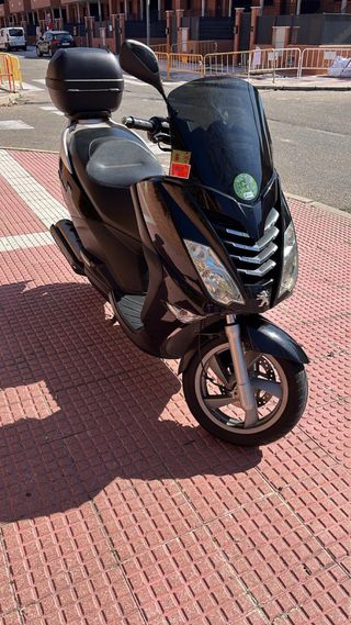 Maxi scooter Peugeot Citystar en color negro. Ideal para moverse por la ciudad con comodidad. - Diseño moderno y elegante. - Asiento amplio y confortable. - Cúpula alta para mayor protección. - Baúl trasero para almacenamiento adicional.