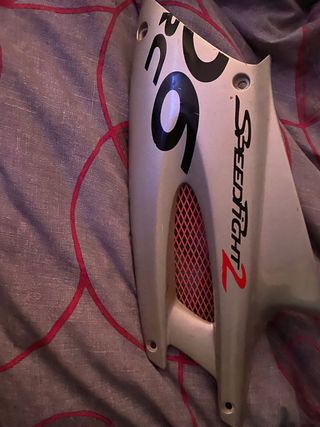 Scooter Peugeot Speedfight con un diseño único y llamativo. - Decoración personalizada con múltiples pegatinas. - Ruedas con detalles en rojo. - Escape deportivo va de serie sólo lleva el escape doy con un carburador del 19 y las piezas de serie. •Tiene itv •lleva vinilos personalizados Hago cambio por moto de marchas, o dinero