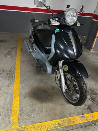Scooter de dos plazas en colores blanco y negro. - Diseño moderno y elegante. - Asiento cómodo para conductor y pasajero. - Ruedas de aleación negras. Tiene 31.000 kms. Todos los services en casa oficial Vespa Aladro. Batería, rodillos, bujía y todo cambiado a los 30.000 kms. Demostrable con factura. Tiene el guardabarro pegado porque me la tiraron. ITV vigente hasta septiembre.