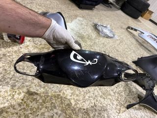 Quilla para Aprilia SR y Piaggio Typhoon. Pieza de plástico negro con soportes metálicos. Se vende quilla bajera para Aprilia SR y Piaggio - Diseño específico para los modelos mencionados. - Presenta marcas de uso y suciedad.
