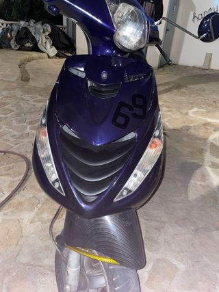Scooter Piaggio Zip de 49cc en color azul. lo mejor Esque con el flash es morado i azul,de noche es negro el color nuevas ruedas la cambio por una jog rr está todo de casa Sin ITV ni seguro pero con papeles funciona todo,tiene los topes quitados i va a 75km esta nueva