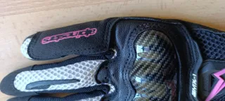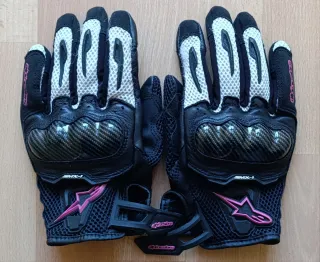 Guantes de moto Alpinestars SMX-1 en talla M, con un diseño moderno en negro, fucsia y blanco. - Material exterior de cuero y malla. - Protecciones de carbono en los nudillos. - Cierre de velcro ajustable. - Detalles en color fucsia.