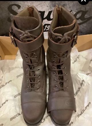 Botas de moto Segura para mujer. Diseño clásico y robusto. - Color marrón oscuro. - Cierre con cordones y hebilla. - Detalle de perforaciones decorativas. No se realizan envíos;solo recoger.