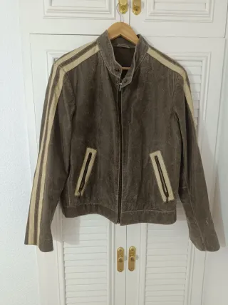 Chaqueta de cuero estilo motero con un diseño clásico y detalles distintivos. Efecto cuero desgastado. Talla M. Más o menos 1'70-1'75 no más de 80 kilos. Se puede probar. Autentica de cuero. Nada de mierdas sintéticas. De peletería. - Color marrón desgastado. - Rayas de color claro en mangas y hombros. - Cuello mao. - Cierre de cremallera frontal. - Bolsillos frontales con cremallera.