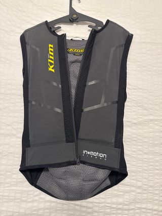 Chaleco de protección con tecnología airbag de la marca Klim. Talla M - Diseño en color gris oscuro. - Paneles laterales de malla transpirable. - Cierre frontal con cremallera. - Detalle de logo In&motion AIRBAG en la parte inferior. Sin uso
