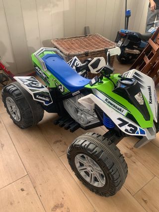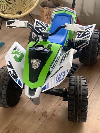 Quad infantil a batería Kawasaki con un diseño deportivo y llamativo. - Color principal verde y blanco. - Estilo todoterreno (off-road). - Ruedas de gran tamaño para mayor agarre. Dos niveles de veloccidad Tambien tiene marcha tras Luz delantera y trasera Hay que poner bateria nueva para mayor autonomia, la bateria se vende en amazon