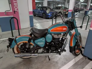 Moto Royal Enfield Classic 350, edición especial Goan. - Diseño distintivo en azul y naranja. - Estilo cruiser clásico. - Transmisión manual.