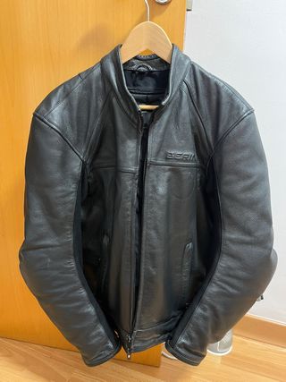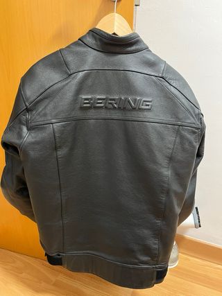 Chaqueta de moto Bering de cuero negro, diseñada para carretera, con protecciones. Esta impecable y se vende por tallaje grande. Talla L - Material: Cuero - Color: Negro - Estilo: Carretera