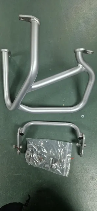 Protector de motor de metal plateado para R1200GS original Wunderlich. Lado derecho y sujeccion frontal. En perfecto estado. La del otro lado no la tengo por estar golpeada. - Fabricado en metal resistente. - Diseño tubular. - Incluye kit de montaje.
