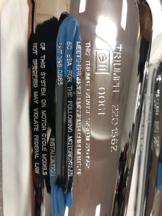 Sistema de escape original para Triumph Thunderbird 900. - Nuevos. Sin uso alguno - Cumple con los requisitos de emisión de ruido EPA. - Homologado con sello E11. 220 1561. Y 220 562 - Código de pieza: SMT 398 0885 - Diseñado para la instalación en motocicletas específicas.