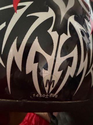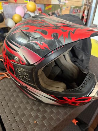 Casco de moto con diseño llamativo. - Color principal negro con detalles en rojo y gris. - Estilo deportivo para enduro y motocross. talla M