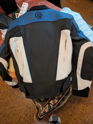 Chaqueta de cuero para moto con un diseño deportivo y moderno. - Combinación de colores negro, azul y blanco. - Incorpora protecciones. - Cierre frontal con cremallera. -Talla M