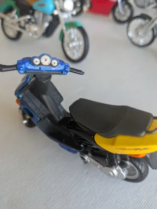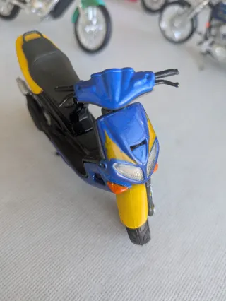 Réplica detallada de la moto Peugeot Speedfight. - Diseño deportivo en colores azul y amarillo. - Estilo scooter. - Ideal para coleccionistas. Hago precio por pack de varias motos