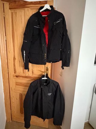 Dos abrigos de moto para hombre en talla XL. El mas fino se pone debajo del mas grueso. Uno de ellos es negro con forro rojo y el otro es completamente negro. - Abrigo negro con forro interior rojo. >> lleva protección en los hombros y los codos - Abrigo negro. Se pone debajo en caso de mas frio o lluvia. - Talla XL. En muy buena condiciones