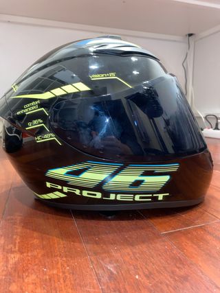Casco de moto negro con detalles en amarillo y diseño 46 PROJECT. - Diseño vision+15. - Detalles comfort enhanced, g-36% y HIC-48%. - Visera oscura.