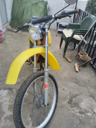 Minicross Puch de estilo motocross, con un llamativo color amarillo. Ni matricula ni papeles,Se vende entera para piezas o reparar ,tengo el motor desmontado ,está trabado el cigueñal de estar parada ,lo tengo todo desmontado ,el resto está bien,#derbi,puch,Gilera,honda,# - Rueda delantera de radios. - Asiento desgastado. - Guardabarros delantero de plástico.