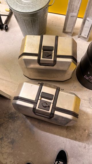 Maletas laterales para moto de la marca Shad. Diseño robusto y funcional. - Color plateado y negro. - Cierre de seguridad. - Una de ellas cuenta con un golpe como se puede ver en la imagen.