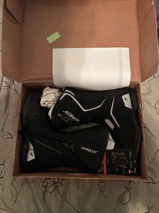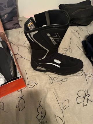 Botas de moto Seventy en talla 46. Diseñadas para ofrecer protección y comodidad. Se han utilizado 1 vez. - Color negro con detalles blancos. - Cierre con cremallera y velcro. - Suela antideslizante.