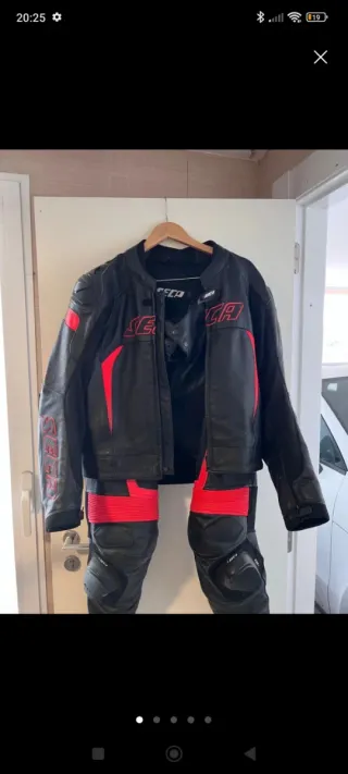 Mono de cuero de dos piezas de la marca SECA, ideal para motociclismo. Diseñado para ofrecer protección y comodidad. - Chaqueta y pantalón unidos. - Color negro con detalles en rojo. - Material: cuero.