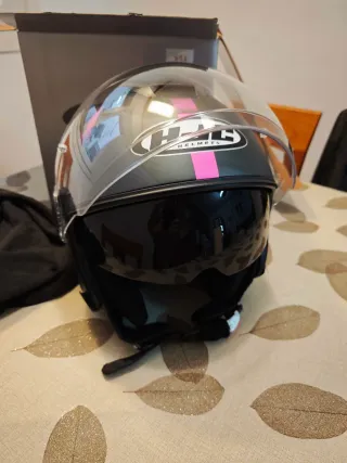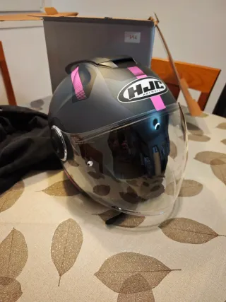 Casco de moto estilo jet de la marca HJC, con un diseño moderno en negro y detalles en rosa. - Diseño deportivo. - Visera transparente. - Cierre de seguridad.